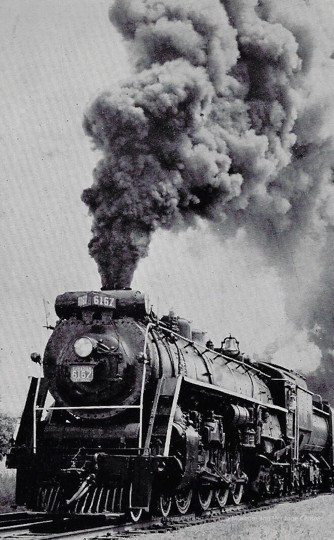 "Canadian National Railways No. 6167. Northern type, Class U-2E throws a fine plume of smoke as it highballs through Madoc Junction, Ontario, July 9, 1961. Photo by Jim Brown, Toronto, Ontario."Language