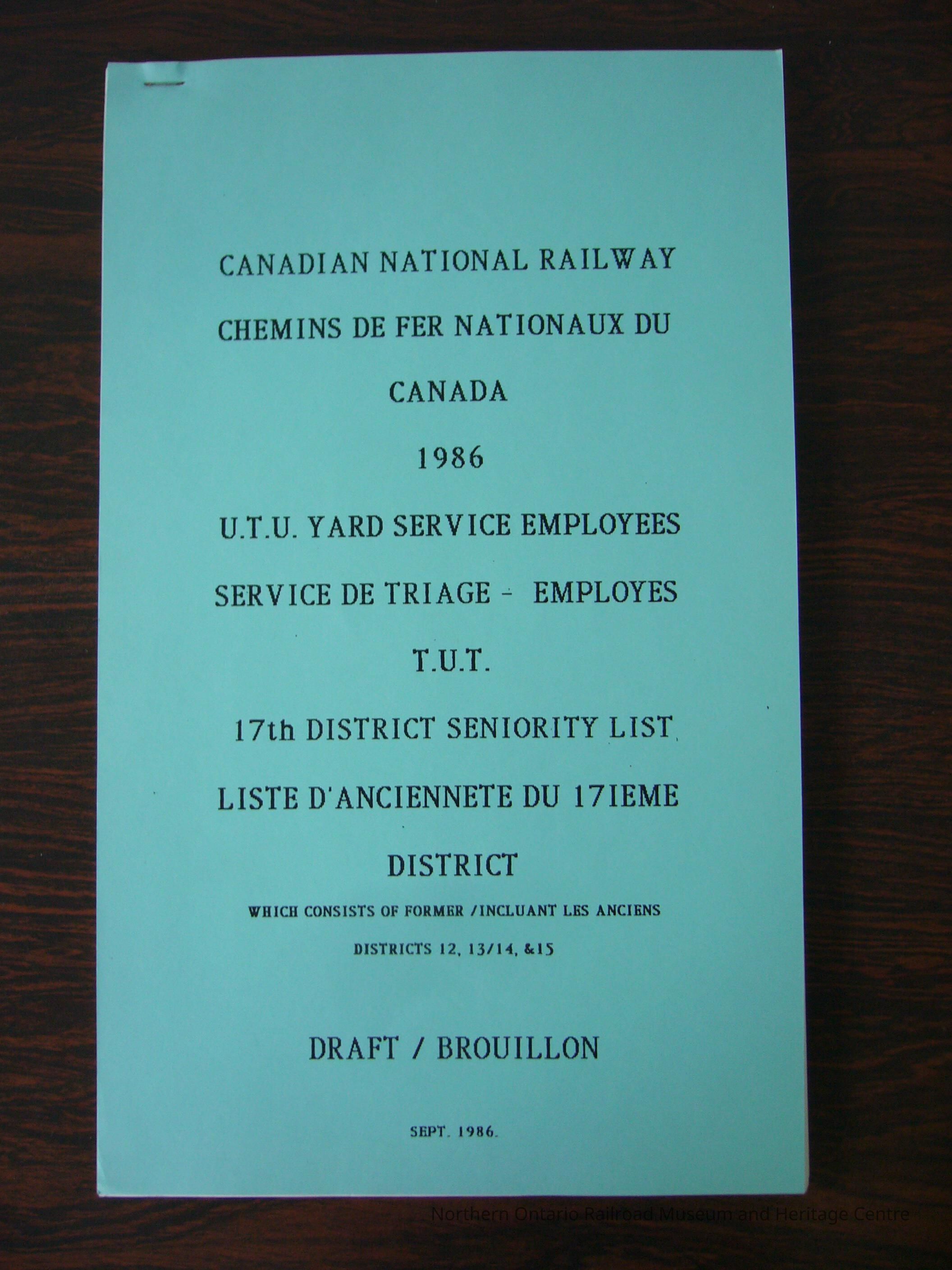 Canadian National Railway 1986 U.T.U. Yard Service Employees 17th District Seniority List which consists of former districts 12, 13/14, & 15. Draft. In French and English.Collection