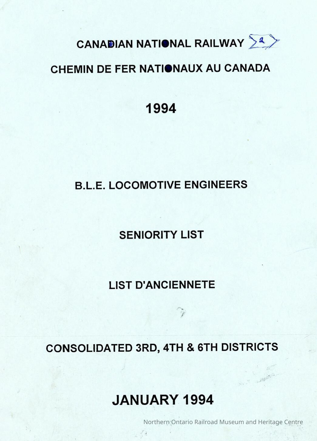 Canadian National Railway, 1994, BLE Locomotive Engineers Seniority List, Consolidated 3rd, 4th, and 6th Districts January 1, 1994.Collection