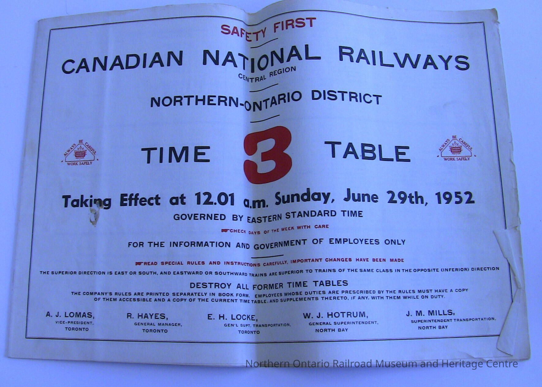 Canadian National Railway, Central Region Northern-Ontario District Timetable 3, Taking Effect at 12.01 a.m. Sunday, June 29th, 1952Entry/Object ID