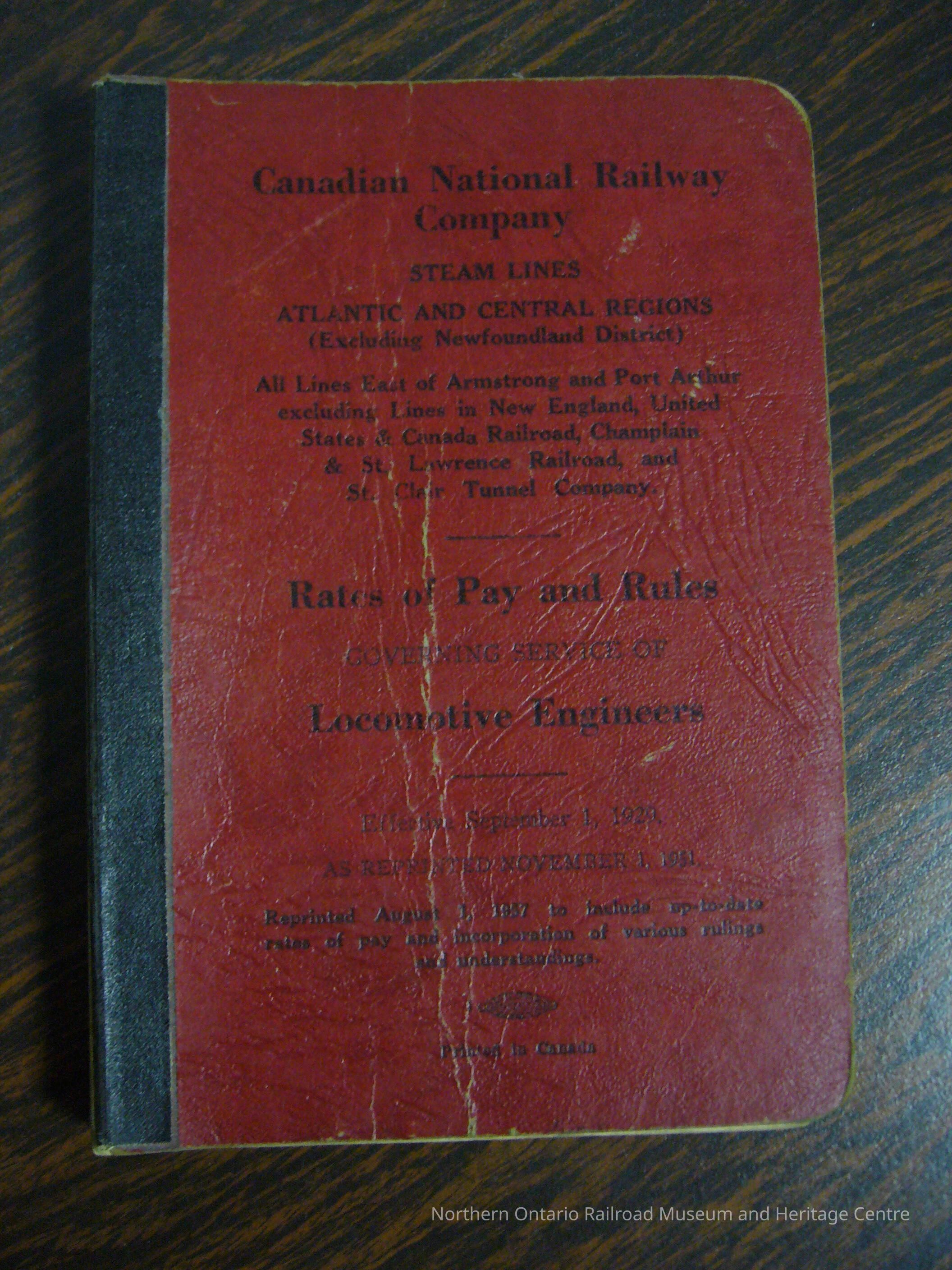 Canadian National Railway Company Steam Lines, Atlantic and Central Regions Rates of Pay and Rules Governing Service of Locomotive Engineers. Effective September 1, 1929. As reprinted November 1, 1951. Reprinted August 1, 1957 to include up-to-date rates of pay and incorporation of various rulings and understandings.