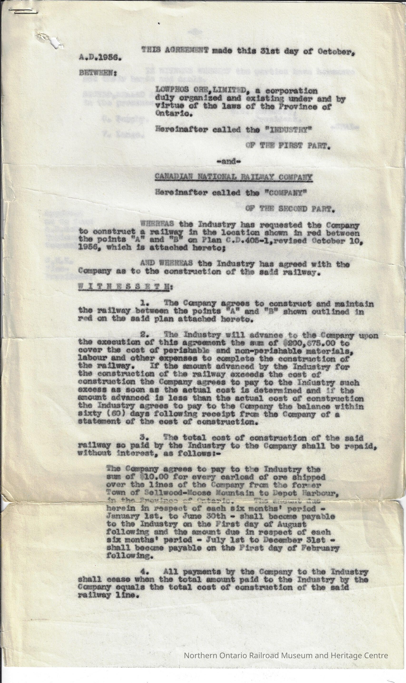 Formal and finalized agreement made between Canadian National and Lowphos Ore Limited for the construction of a railway for Lowphos to use. The agreement lines out the responsibilities of each party.