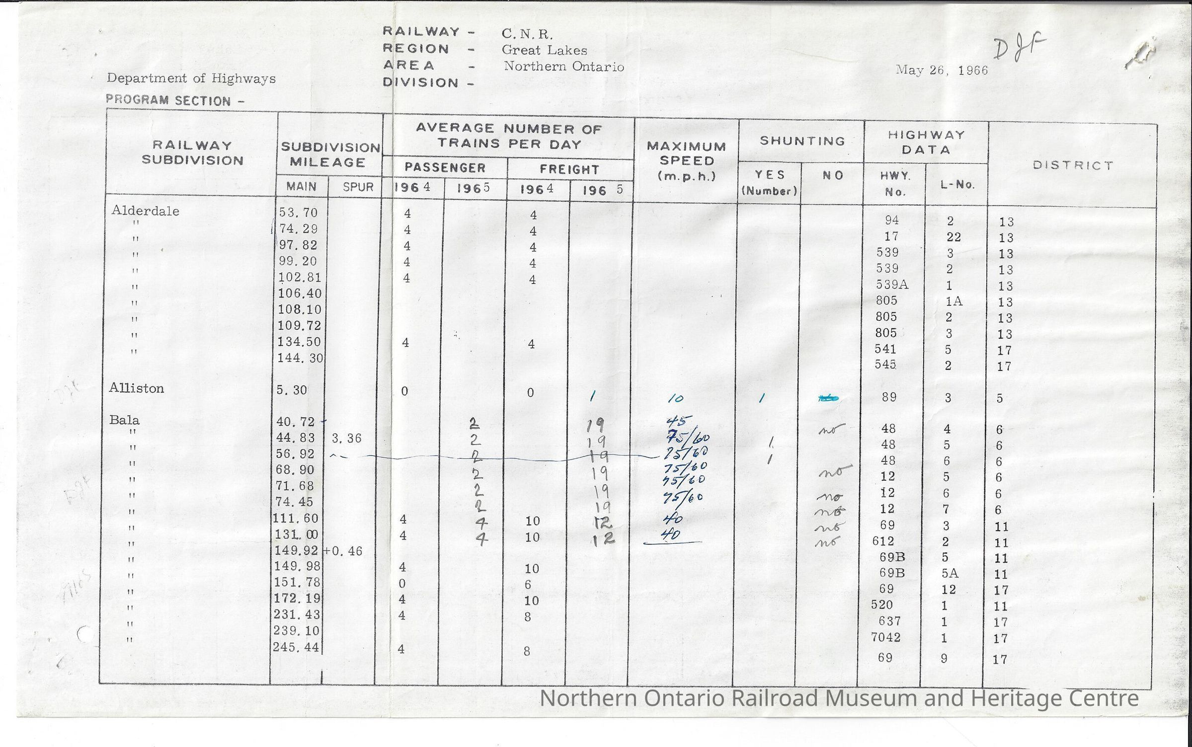Report, railway crossing inventory sheets for the Northern Ontario Area. The log reports on the: railway subdivisions, subdivision mileage, average number of trains per day: passenger or freight, maximum speed, shunting, highway data and district for each subdivision in the Northern Ontario area between 1964 and 1966. The subdivisions include: Alderdale, Alliston, Bala, Beachburg, Beeton, Camp Borden, Caramat, Huntsville, Kapuskasing, Meaford, Midland, Newmarket, Oba, Penetang, Ruel, Sudbury, Sudbury Terminal.