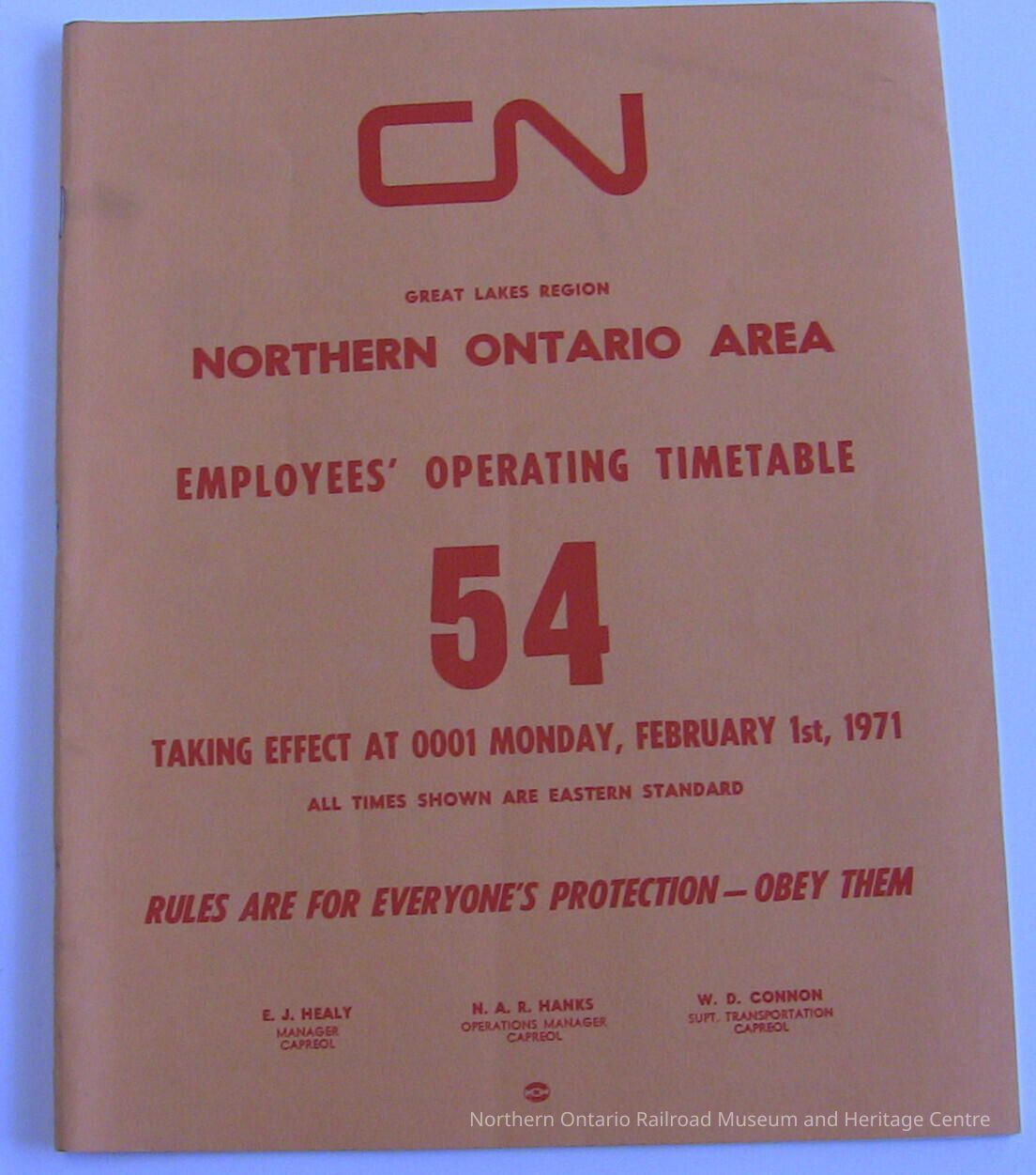 Canadian National Railway, Great Lakes Region, Northern Ontario Area, Employees' Operating Timetable 54, Taking Effect at 0001, Monday, February 1st, 1971Entry/Object ID