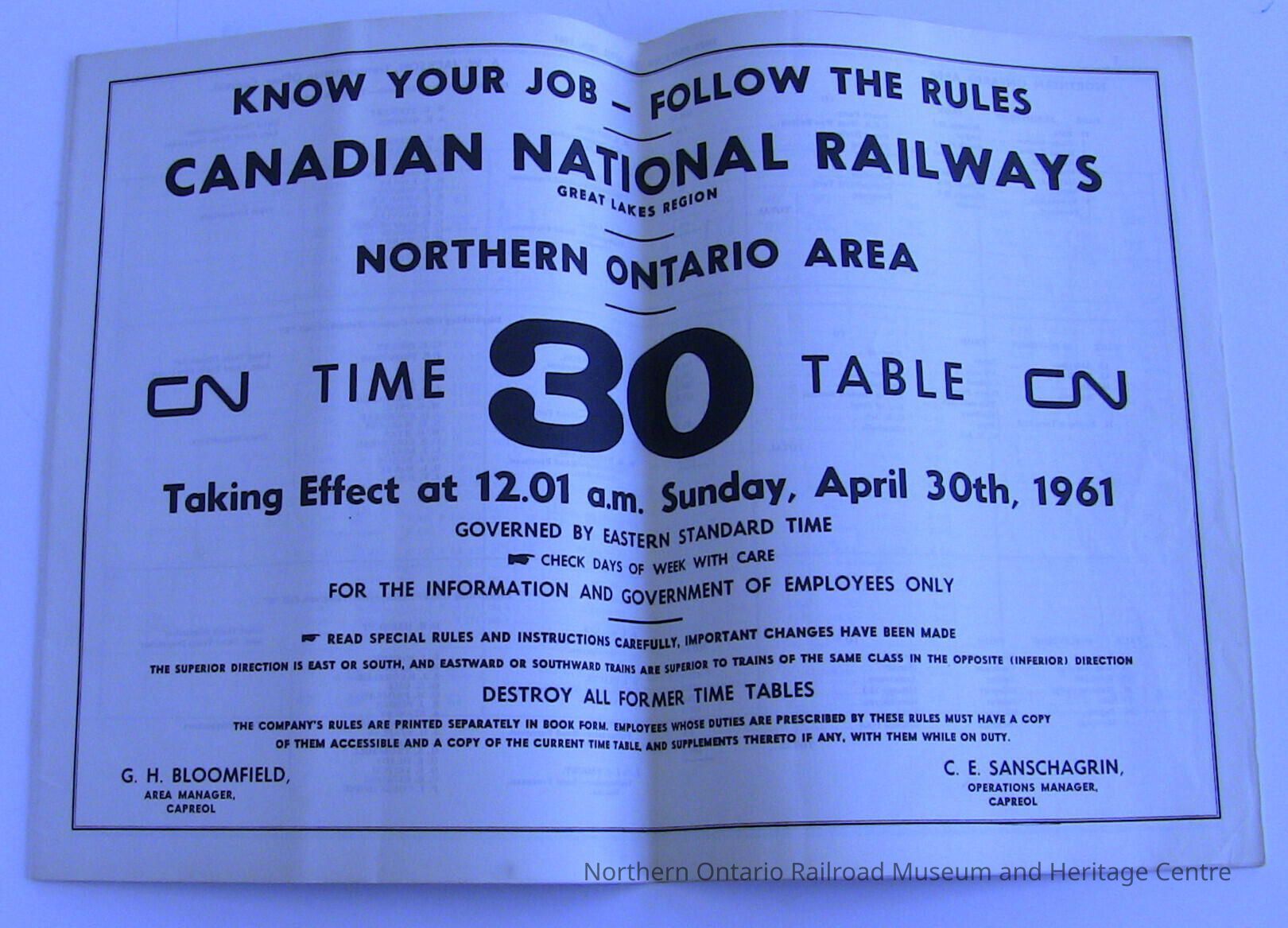 Canadian National Railway, Great Lakes Region, Northern Ontario Area, Timetable 30, Taking Effect at 12:01 am, Sunday, April 30th, 1961Entry/Object ID