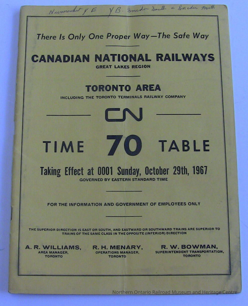 Canadian National Railway, Great Lakes Region, Toronto Area, Employees' Operating Timetable 70, Taking Effect at 0001, Sunday, October 29th, 1967Entry/Object ID
