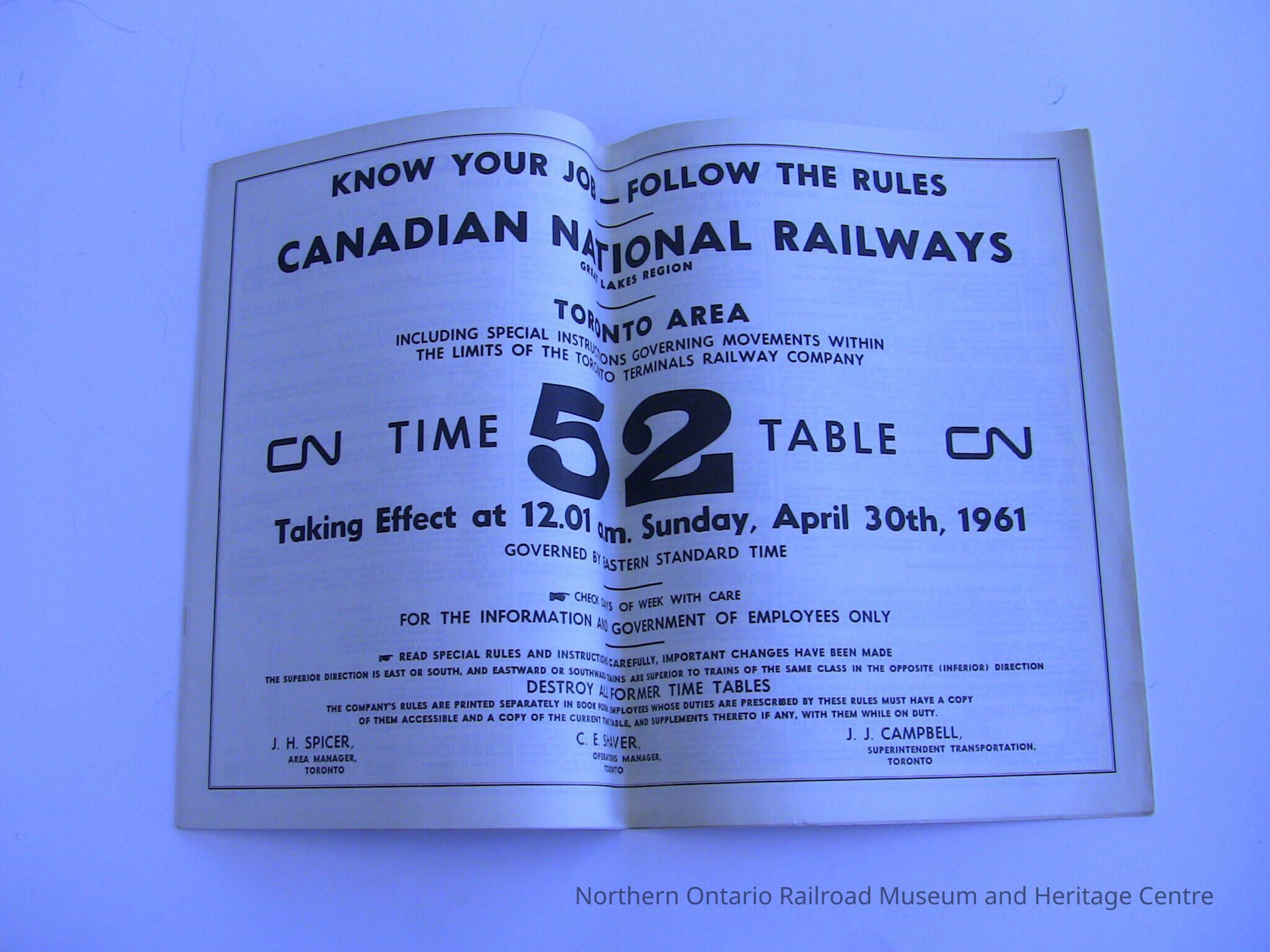 Canadian National Railway, Great Lakes Region, Toronto Area, Timetable 52, Taking Effect at 12:01 am, Sunday, April 30th, 1961Entry/Object ID