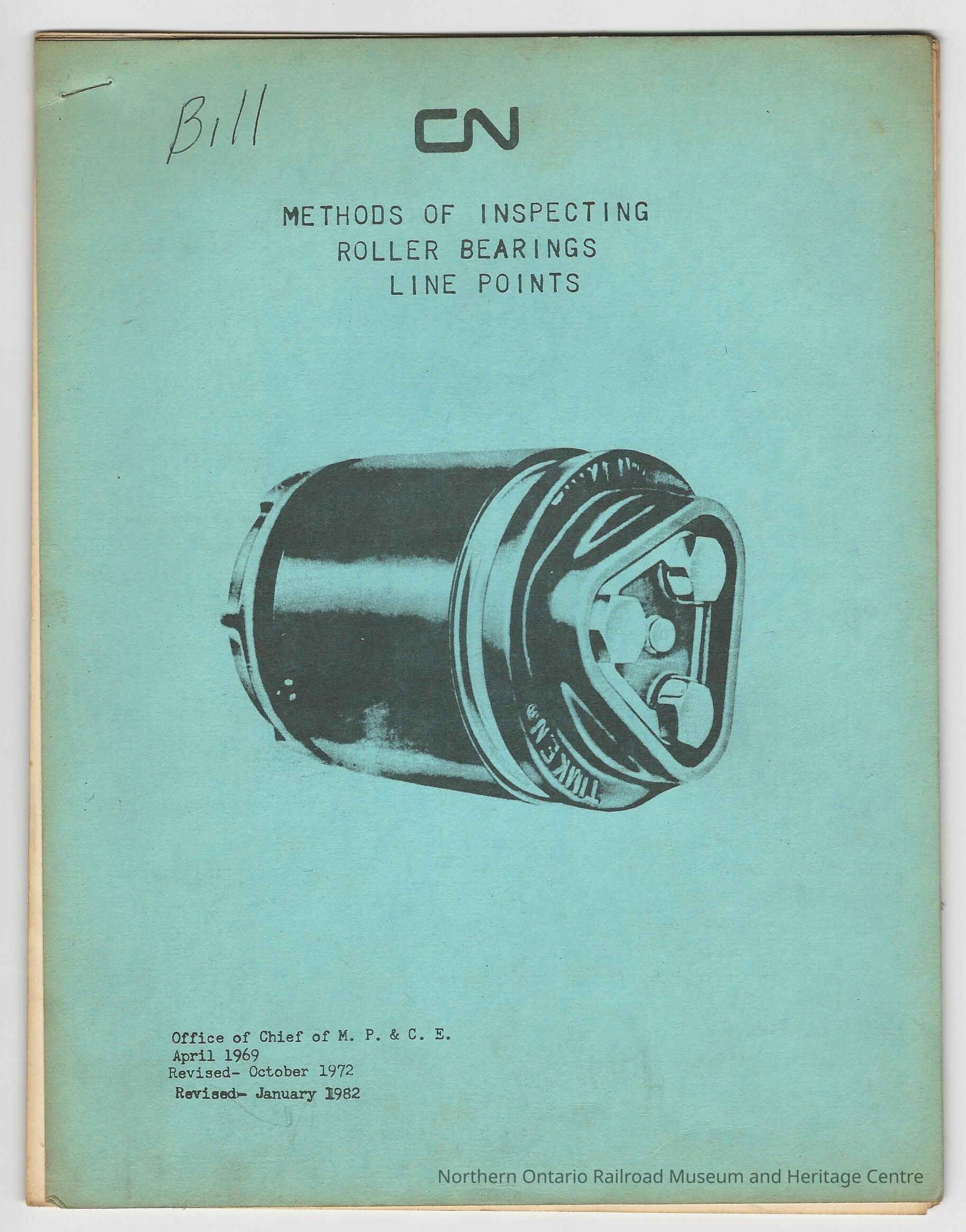 Book, manual for methods of inspecting roller bearings and line points for Canadian National. Includes: nomenclature, general, roller bearing operating temperature, adapters, cap bolts, seals, grease plugs, AAR mandatory rules- derailment, flood, storage, handling, welding, lubrication, conclusion