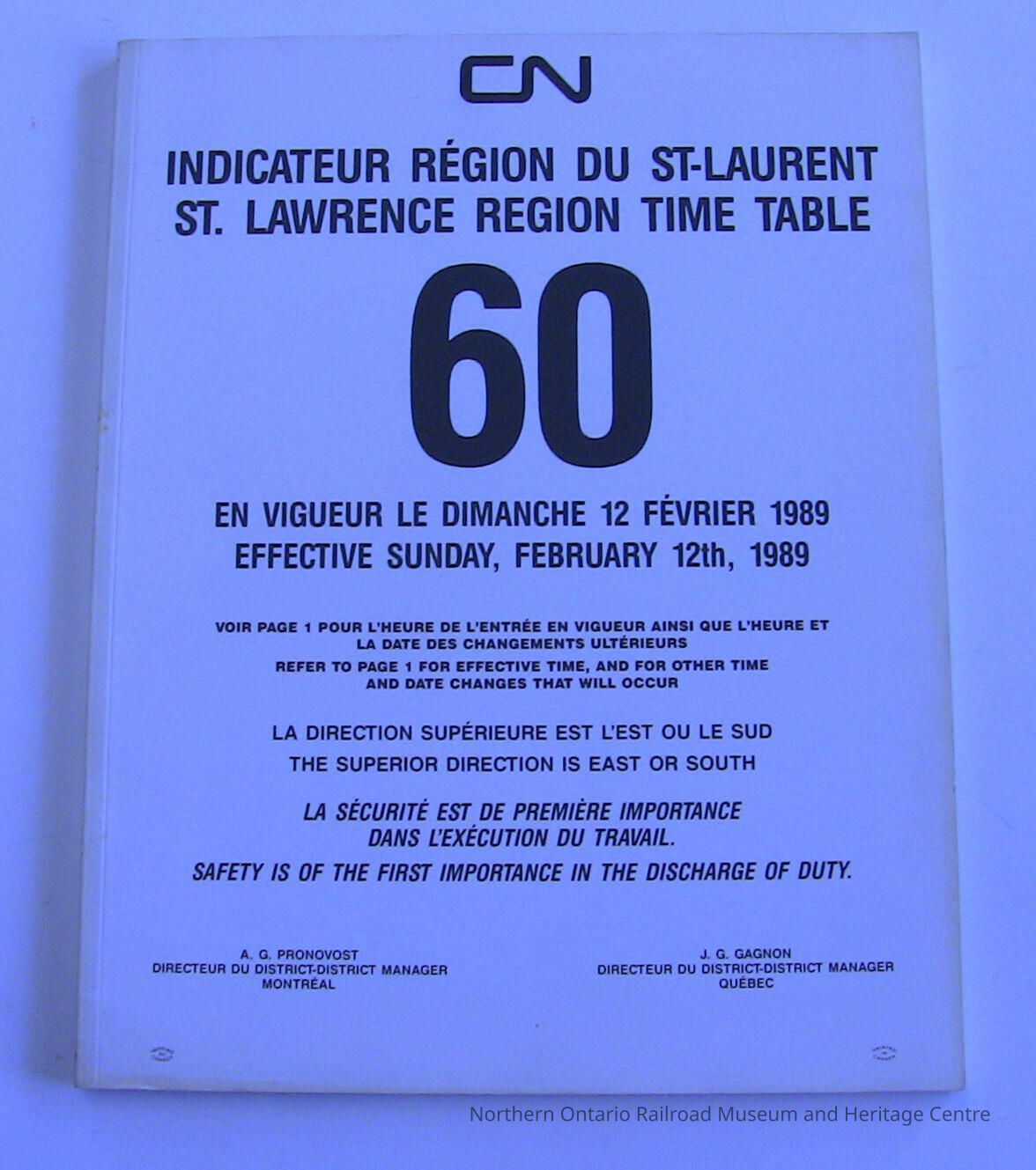 Canadian National Railway, St. Lawrence Region Timetable 60, Effective Sunday, February 12, 1989Entry/Object ID