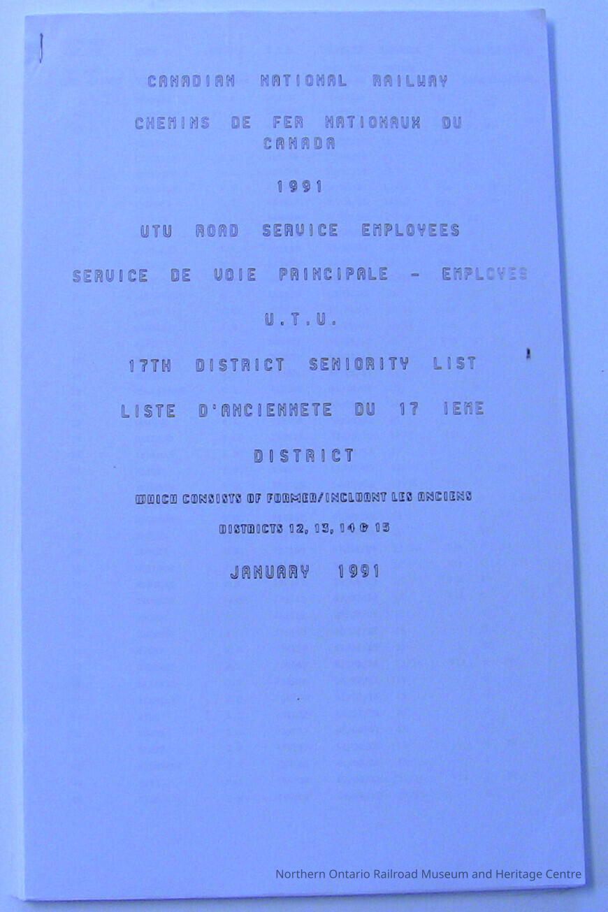 A 1991 seniority list for CN UTU Road Service Employees in the 17th District.Collection