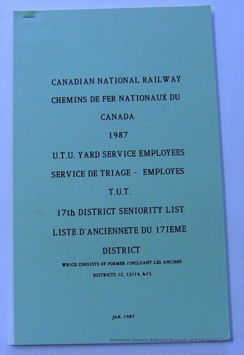 Canadian National Railway, UTU Yard Service Employees, 17th District Seniority List 1987Description