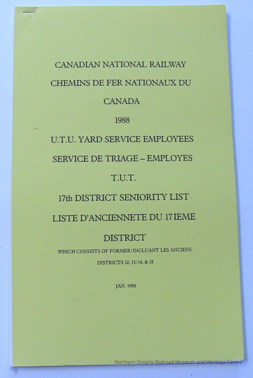 Canadian National Railway, UTU Yard Service Employees, 17th District Seniority List 1988Description