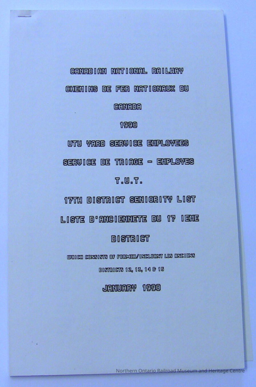 Canadian National Railway, UTU Yard Service Employees, 17th District Seniority List 1990Description