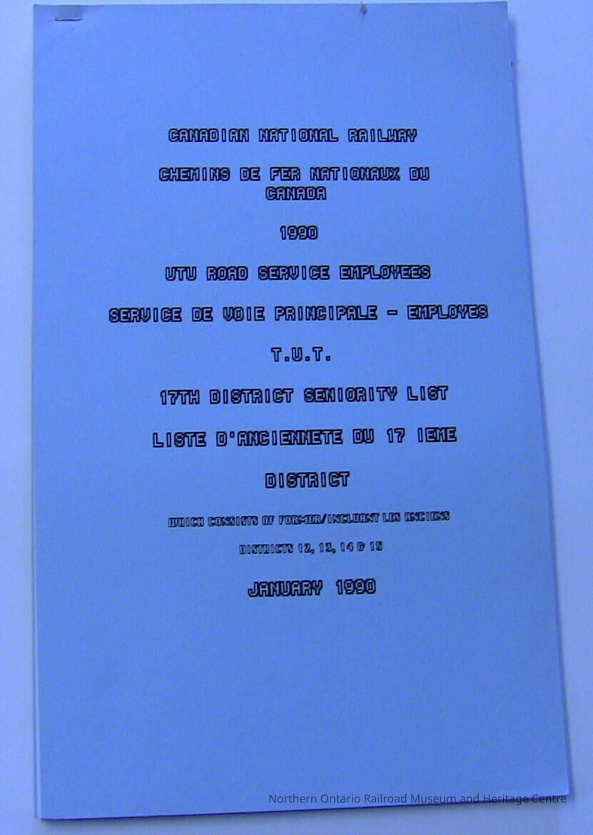 Canadian National Railway, UTU Yard Service Employees, 17th District Seniority List 1990Description
