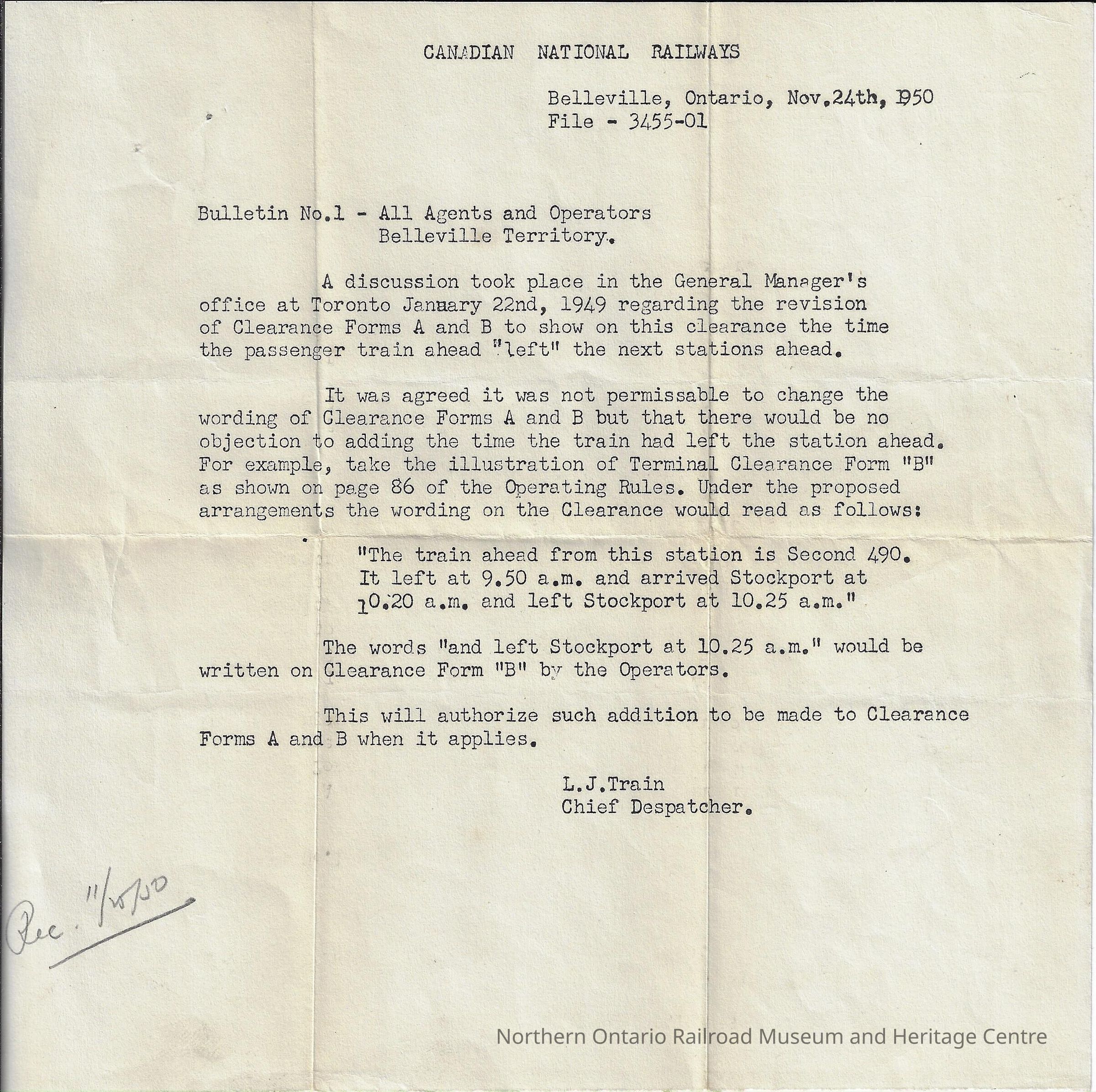 Canadian National Railways - All Agents and Operators Belleville Territory Bulletin No. 1Entry/Object ID