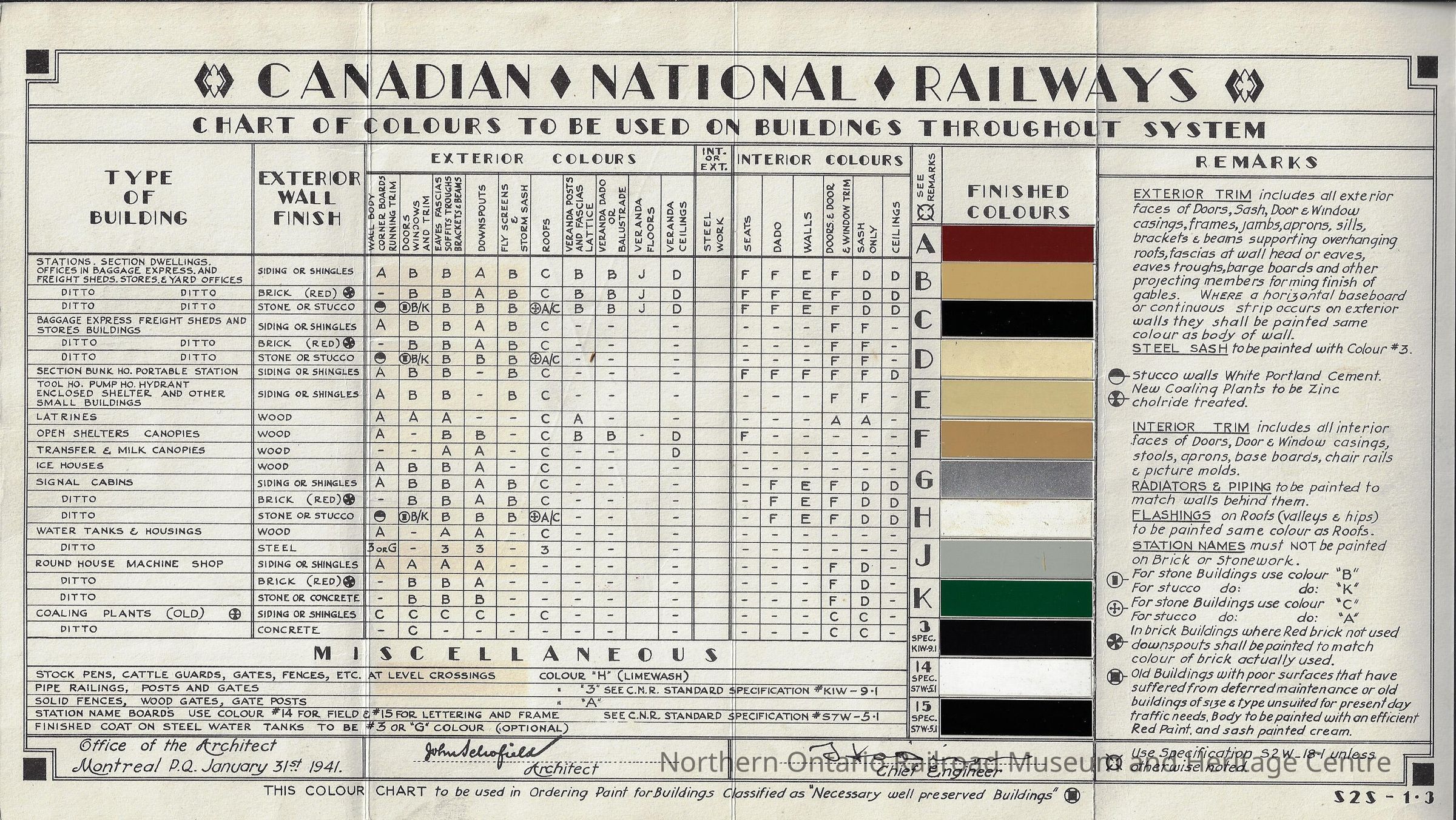 Pamphlet describing the building colours for all of the types of buildings owned by Canadian National. This includes: stations, section dwellings, offices in baggage express, freight sheds, stores, yard offices, section bunk house, portable station, tool house, pump house, hydrant enclosed shelter, latrines, open shelters , canopies, transfer and milk canopies, ice houses, signal cabins, water tanks and housings, round house machine shops, and coaling plants. There are also miscellaneous structures and items: stock pens, cattle guards, gates, fences, pipe railings, posts, gates, solid fences, wooden gates, gate posts, station name boards, finished coat on steel water tanks.