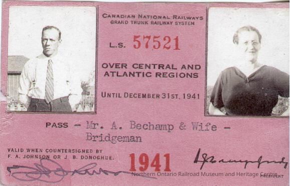Canadian National branded central region railroad pass issued to A. (Allen) Bechamp and his wife in the year 1941. Bechamp was working as a bridgeman at the time. The pass allowed him and his wife to travel on any Canadian National passenger train passing in the central region. The pass was valid until December 31st, 1941. The pass was awarded to him for having given 10 or more years of service.