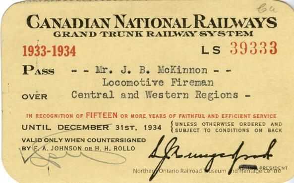 Canadian National central and western regions pass issued to John Bergen McKinnon in the year 1933. John Bergen was a locomotive fireman. The pass allowed him to travel on any passenger train in the central and western regions during the year 1933-1934. It was awarded to Bergen for 15 years of service. The reverse side features conditions of the pass.