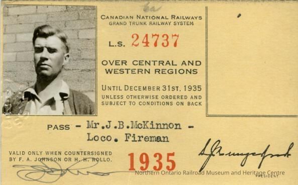 Canadian National central and western regions pass issued to John Bergen McKinnon in the year 1935. John Bergen was a locomotive fireman. The pass allowed him to travel on any passenger train in the central and western regions during the year 1935. It was awarded to Bergen for 15 years of service. The reverse side features conditions of the pass.