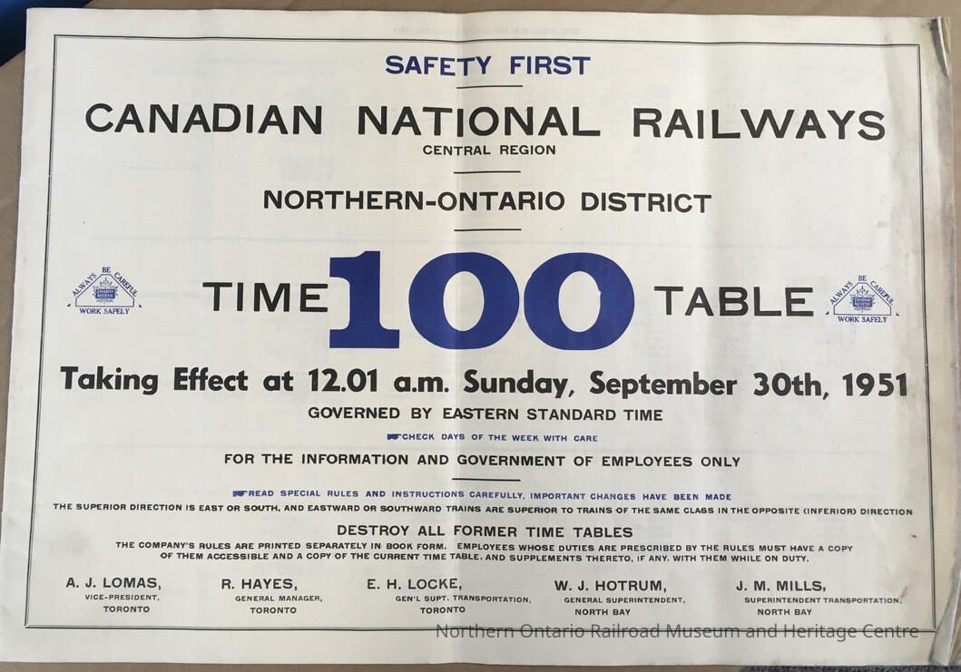 Canadian National Railways, Central Region, Northern Ontario District, Timetable 100, 1951Entry/Object ID
