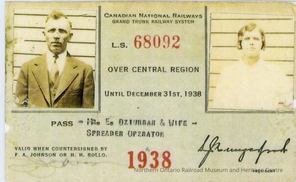 E. Dziurban worked for Canadian National as a spreader operator. The pass belonged to him and could be used by himself and his wife to travel on board any Canadian National passenger train in the central region.