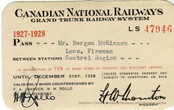 Canadian National central regions pass issued to John Bergen McKinnon in the year 1927. John Bergen was a locomotive fireman. The pass allowed him to travel on any passenger train in the central regions during the year 1927-1928. It was awarded to Bergen for 10 years of service. The reverse side features conditions of the pass.