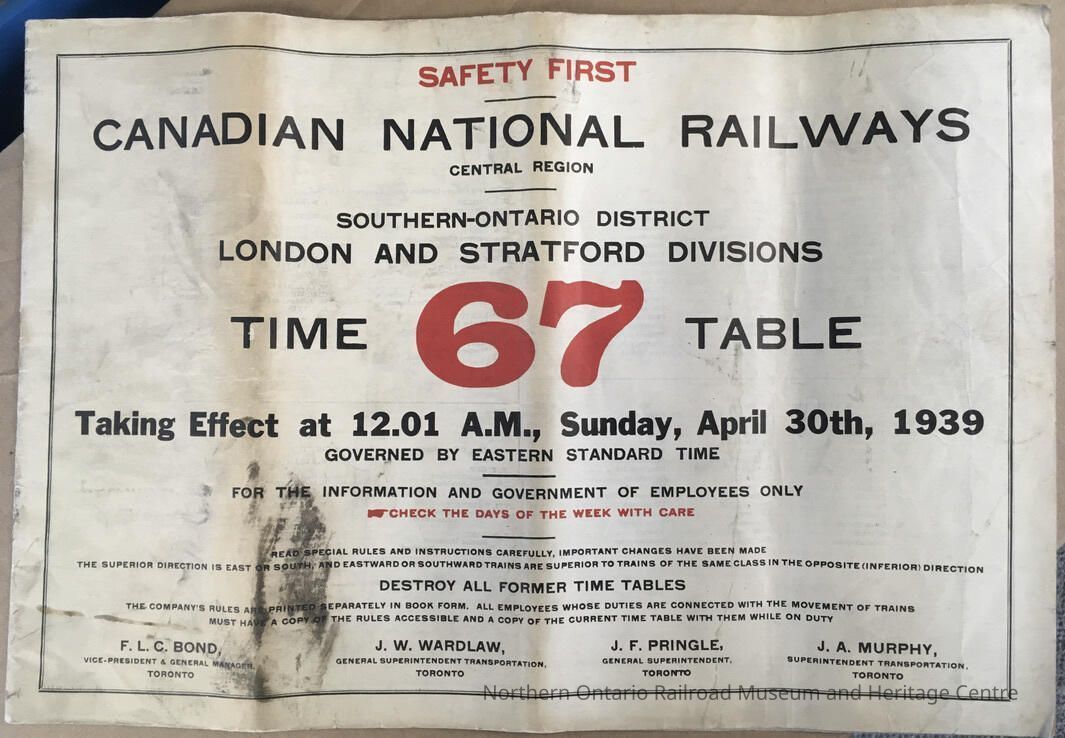 Canadian National Railways, Central Region, Southern Ontario District, London and Stratford Divisions, Timetable 67, 1939Entry/Object ID