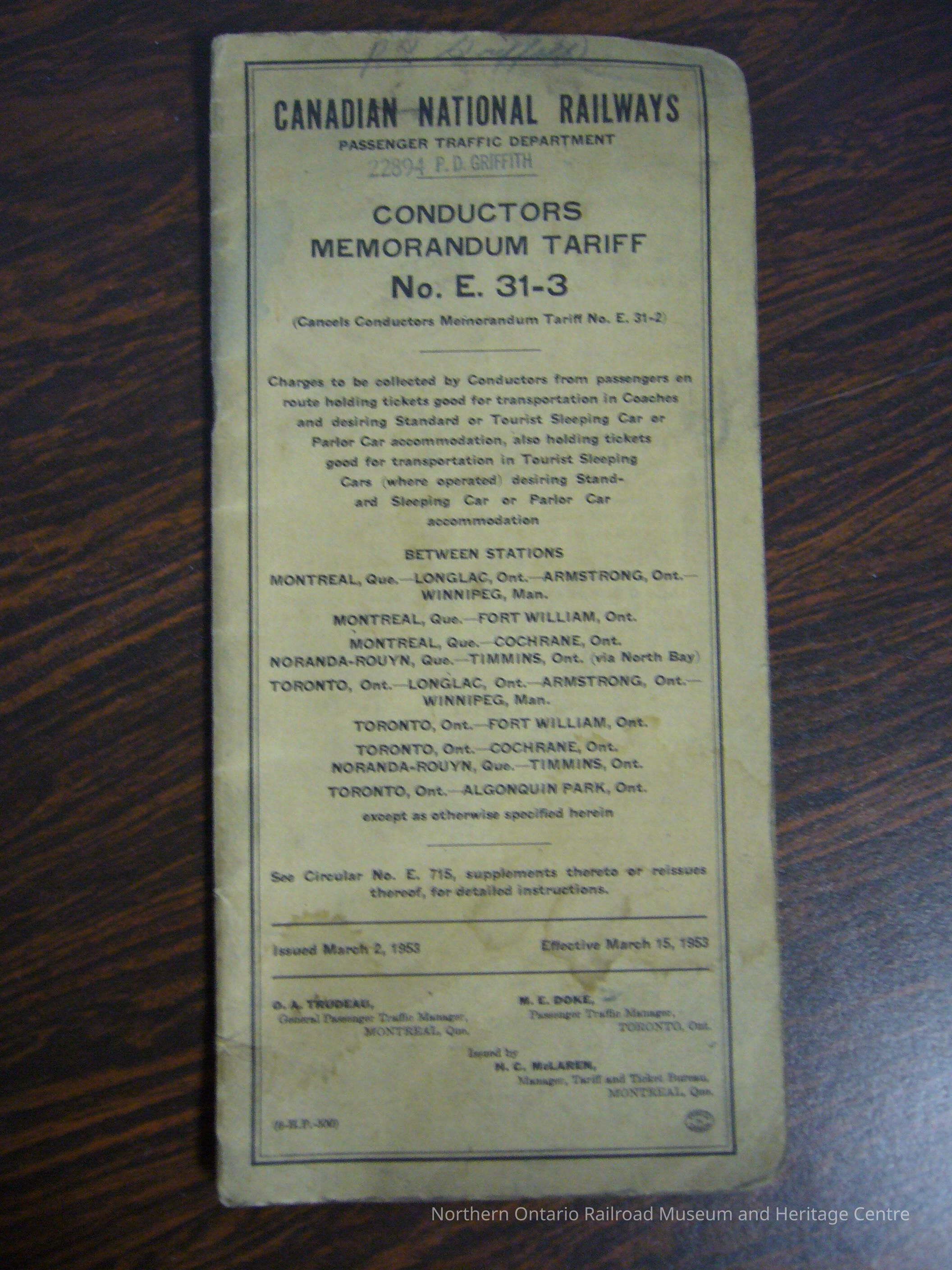 Canadian National Railways Conductors Memorandum Tariff No. E. 31-3. Issued March 2, 1953.