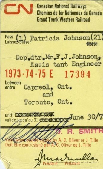 Canadian National Railways Dependants Pass, Capreol-Toronto Patricia Johnson, 1973-1975.Entry/Object ID
