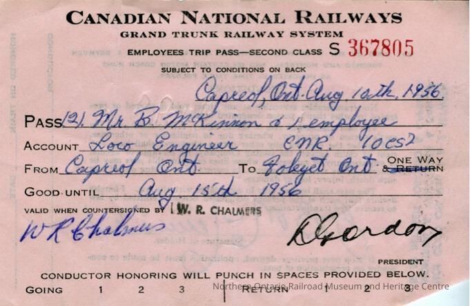 Canadian National branded employee trip pass issued to J. B. McKinnon, John Bergen McKinnon was a locomotive engineer, originally starting as a fireman. The ticket was a one way trip from Capreol to Foleyet, dated August 15th, 1956. It was good for McKinnon as well as one other employee.Context