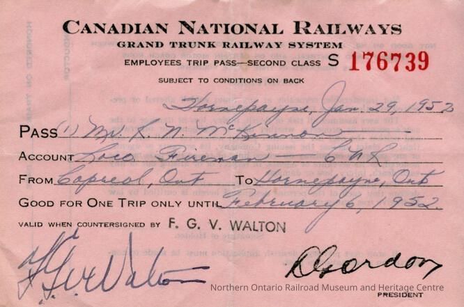 Canadian National branded employee trip pass issued to R. N. McKinnon, Roland McKinnon a fireman, son of John Bergen McKinnon, a locomotive engineer, originally starting as a fireman. The ticket was a one way trip from Capreol to Hornepayne, dated January 29th, 1952. It was good for McKinnon as well as one other employee. It had to be used by February 6th, 1952.