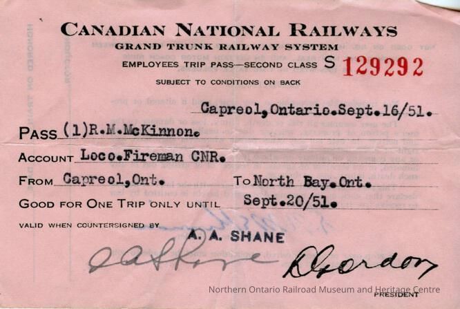 Canadian National branded employee trip pass issued to R. N. McKinnon, Roland McKinnon a fireman, son of John Bergen McKinnon, a locomotive engineer, originally starting as a fireman. The ticket was a one way trip from Capreol to North Bay, dated September 16th, 1951. It was good for McKinnon as well as one other employee. It had to be used by September 20th, 1951.