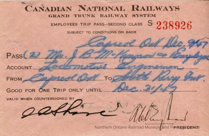 Canadian National branded employee trip pass issued to J. B. McKinnon, John Bergen McKinnon, a locomotive engineer, originally starting as a fireman. The ticket was a one way trip from Capreol to South Parry, dated December 9th, 1947. It was good for McKinnon as well as one other employee. It had to be used by December 31st, 1947.
