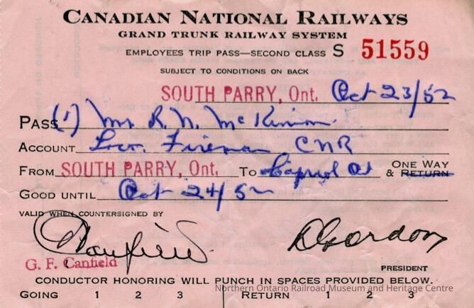 Canadian National branded employee trip pass issued to R. N. McKinnon, Roland McKinnon a fireman, son of John Bergen McKinnon, a locomotive engineer, originally starting as a fireman. The ticket was a one way trip from South Parry to Capreol dated October 23rd, 1952. It had to be used by October 24th, 1952.