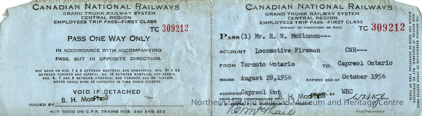 Canadian National branded employee trip pass issued to R. N. McKinnon, Roland McKinnon a fireman, son of John Bergen McKinnon, a locomotive engineer, originally starting as a fireman. The ticket was a round trip from Capreol to Toronto and back, issued August 28th, 1956. It had to be used by October 1956.