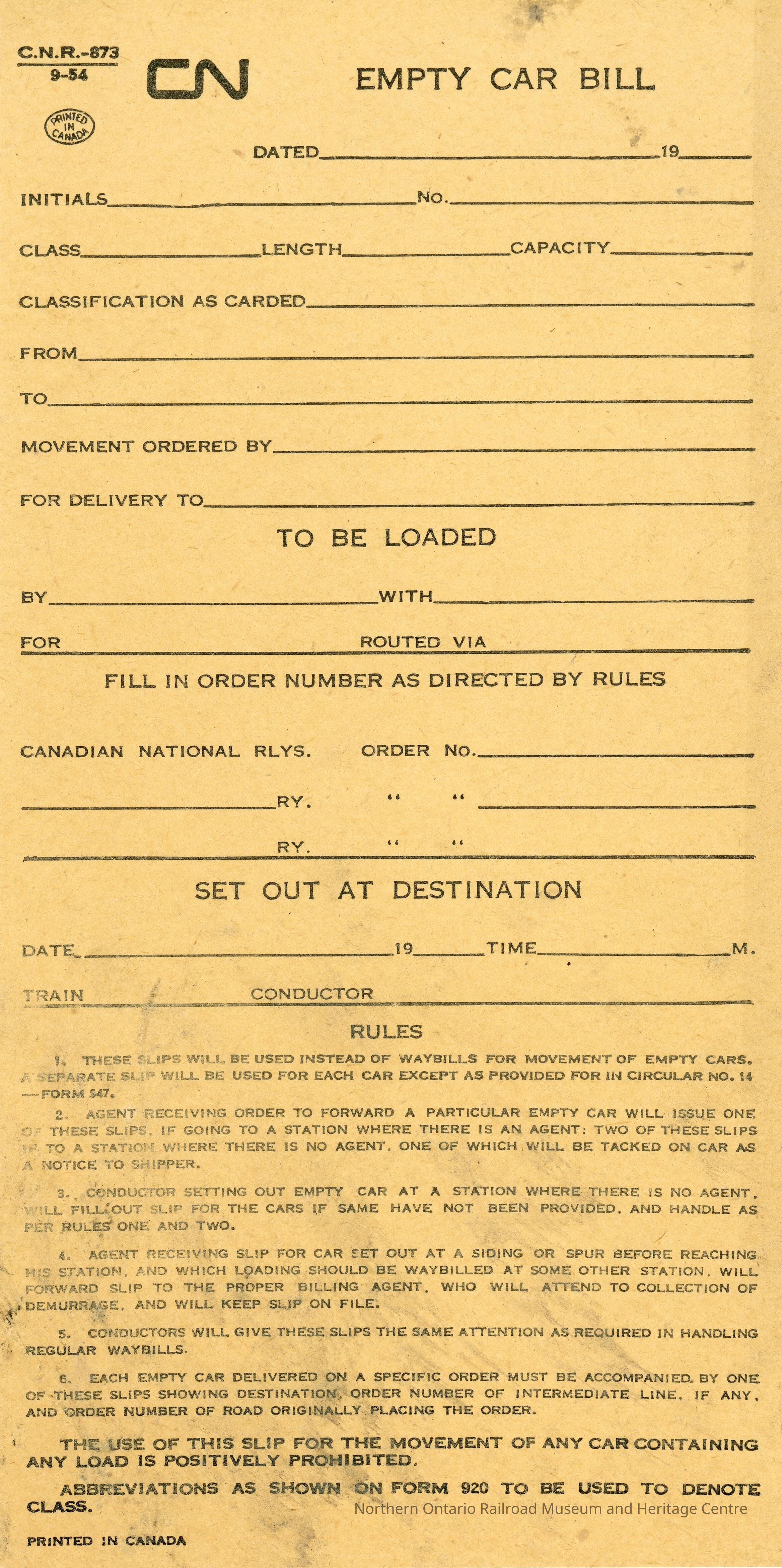 Document, Canadian National branded Empty Car Bill. It is a blank form but has the areas to record: