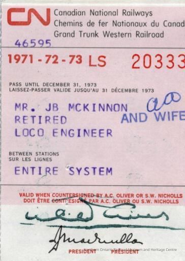 Canadian National branded entire system pass, issued to J. B. John Bergen McKinnon and his wife in 1971. The pass lasted until December 31st 1973 and allowed McKinnon and his wife to travel on the entire Canadian National system for free. The pass was awarded to McKinnon for having given 20+ years of service. The reverse side features conditions of the pass