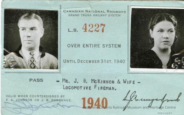 Canadian National branded entire system pass, issued to J. B. John Bergen McKinnon and his wife in 1940. The pass lasted until December 31st 1940 and allowed McKinnon and his wife to travel on the entire Canadian National system for free. The pass was awarded to McKinnon for having given 20+ years of service. The reverse side features conditions of the pass