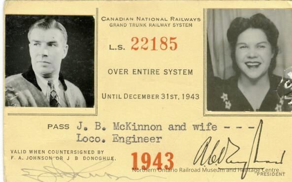 Canadian National branded entire system pass, issued to J. B. John Bergen McKinnon and his wife in 1943. The pass lasted until December 31st 1943 and allowed McKinnon and his wife to travel on the entire Canadian National system for free. The pass was awarded to McKinnon for having given 20+ years of service. The reverse side features conditions of the pass