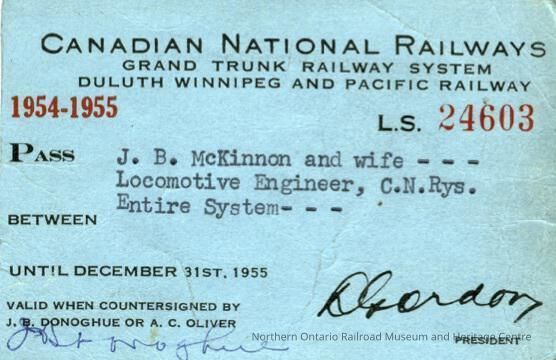 Canadian National branded entire system pass, issued to J. B. John Bergen McKinnon and his wife in 1954. The pass lasted until December 31st 1955 and allowed McKinnon and his wife to travel on the entire Canadian National system for free. The pass was awarded to McKinnon for having given 20+ years of service. The reverse side features conditions of the pass.