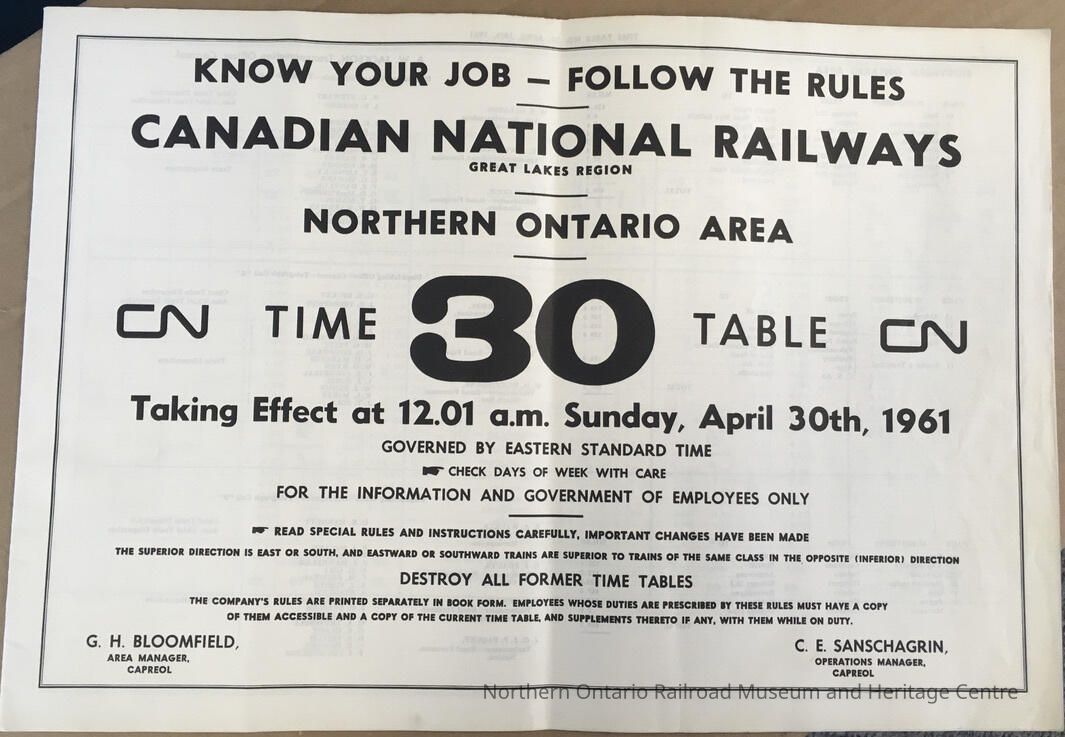 Canadian National Railways, Great Lakes Region, Northern Ontario Area, CN Timetable 30, 1961Entry/Object ID