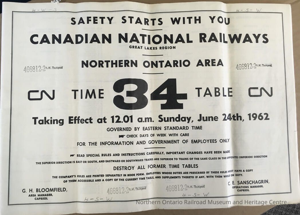 Canadian National Railways, Great Lakes Region, Northern Ontario Area, CN, Timetable 34, 1962Entry/Object ID