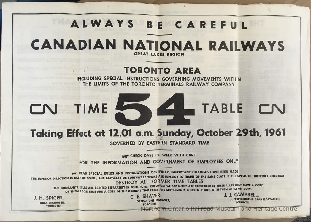 Canadian National Railways, Great Lakes Region, Toronto Area, including special instructions governing movements within the limits of the Toronto Terminals Railway Company, CN, Timetable 54, 1961Entry/Object ID