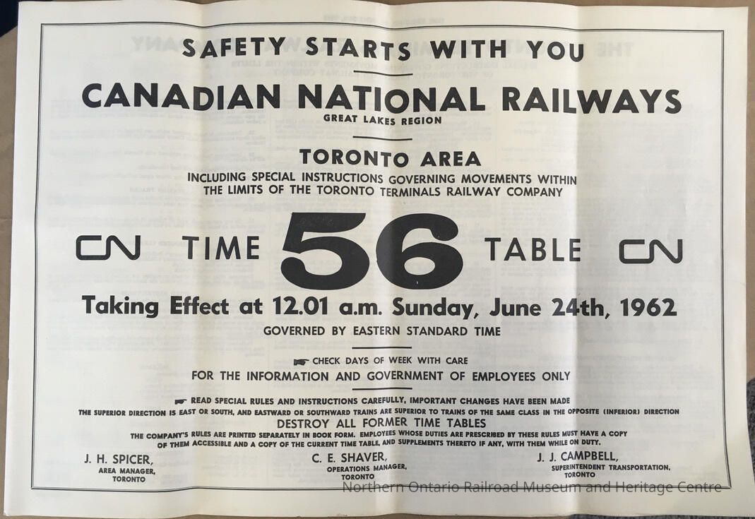 Canadian National Railways, Great Lakes Region, Toronto Area, including special instructions governing movements within the limits of the Toronto Terminals Railway Company, CN Timetable 56, 1962Entry/Object ID