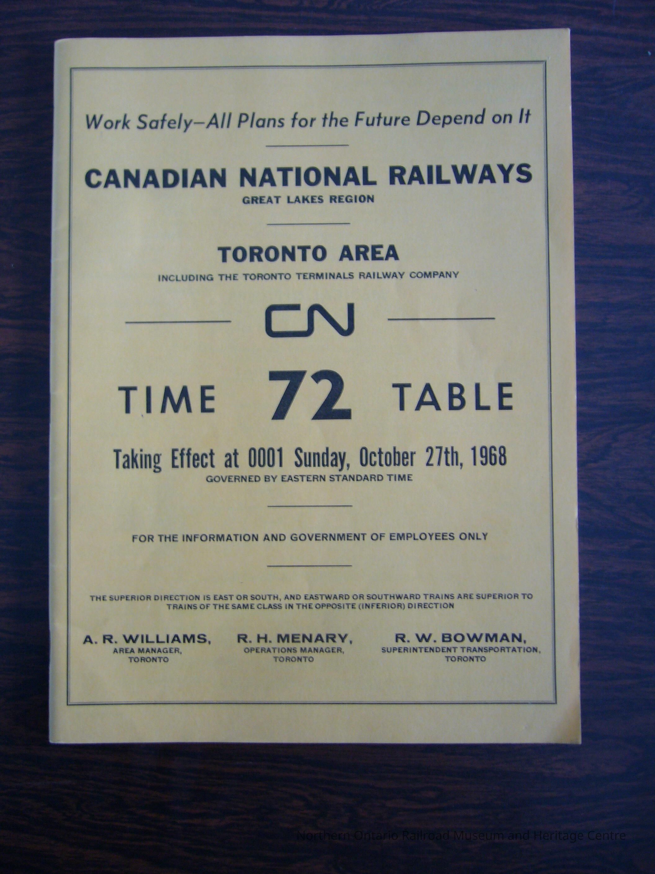 Canadian National Railways Great Lakes Region Toronto Area including the Toronto Terminals Railway Company time table No. 72, taking effect at 0001 Sunday, October 27th, 1968.Collection