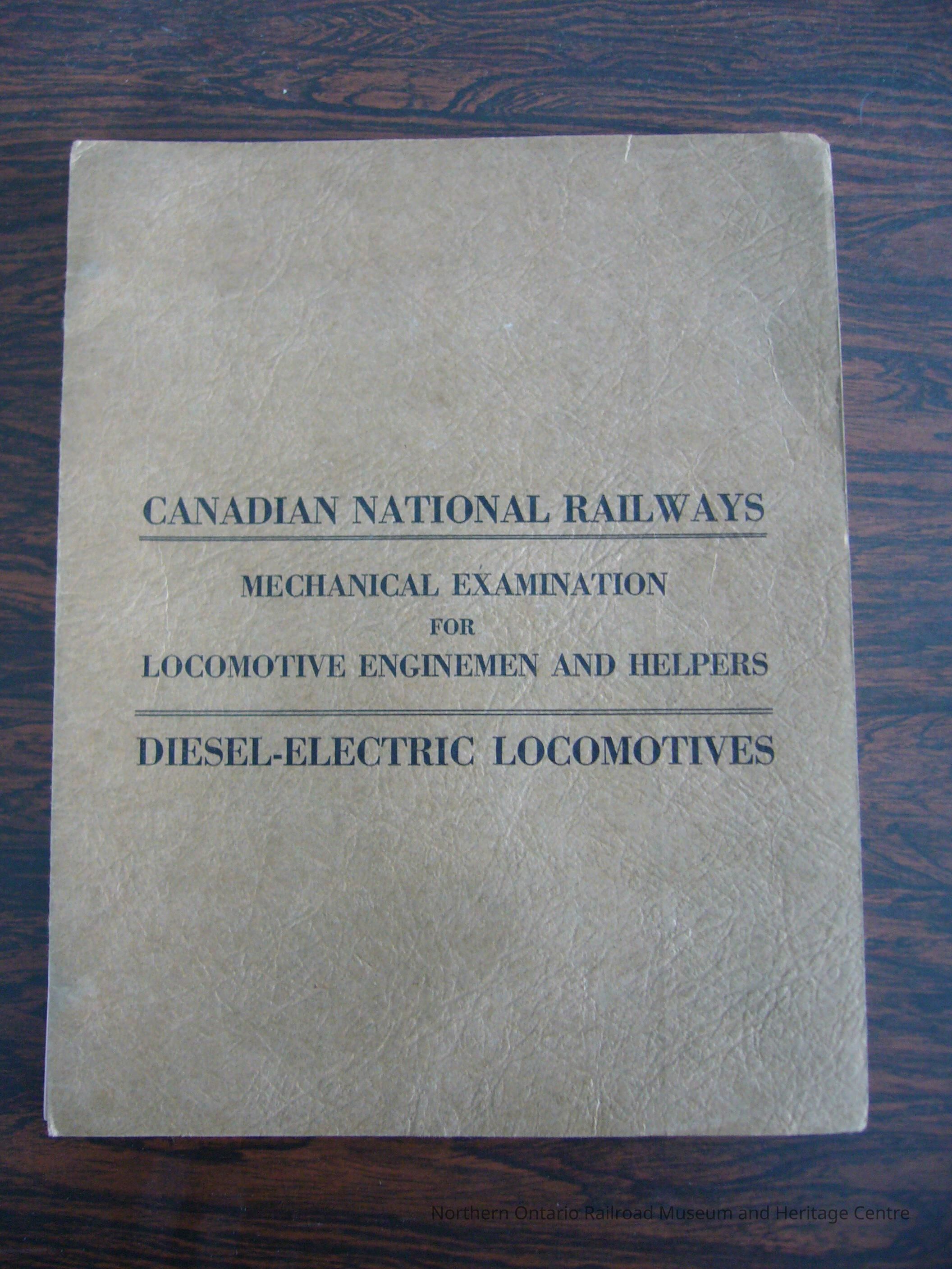 Book, examination preparation book for Canadian National locomotive enginemen and helpers for their mechanical examination on diesel-electric locomotives. The booklet features questions as well as answers to help the workers study. Includes: V-1, E.M.D. Freight, W-1 E.M.D. Freight, Y-3 Cooper-Bessemer, Y-3 Road Switchers, Q-6 ALCO Switchers, Q-5 E.M.D. Switchers, Vapor Clarkson Steam Generators.
