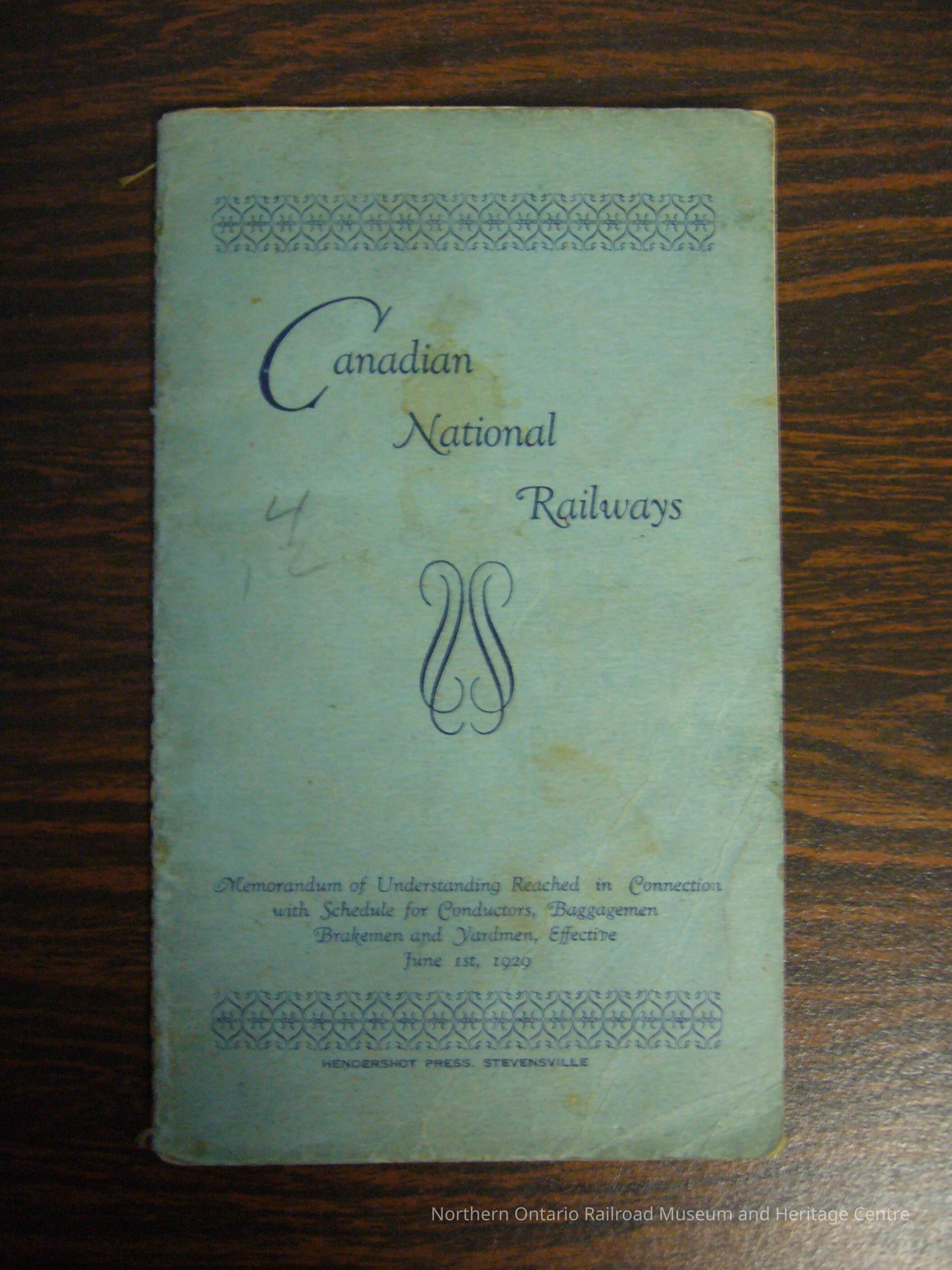 Canadian National Railways Memorandum of Understanding Reached in Connection with Schedule for Conductors, Baggagemen, Brakemen and Yardmen, Effective June 1st, 1929Description