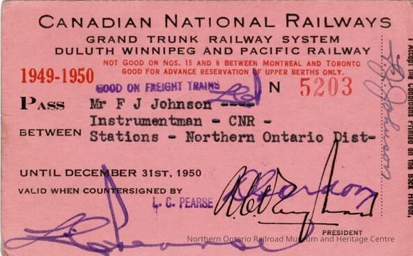 Canadian National Railways Northern Ontario District Pass, FJ Johnson, 1949-1950Entry/Object ID