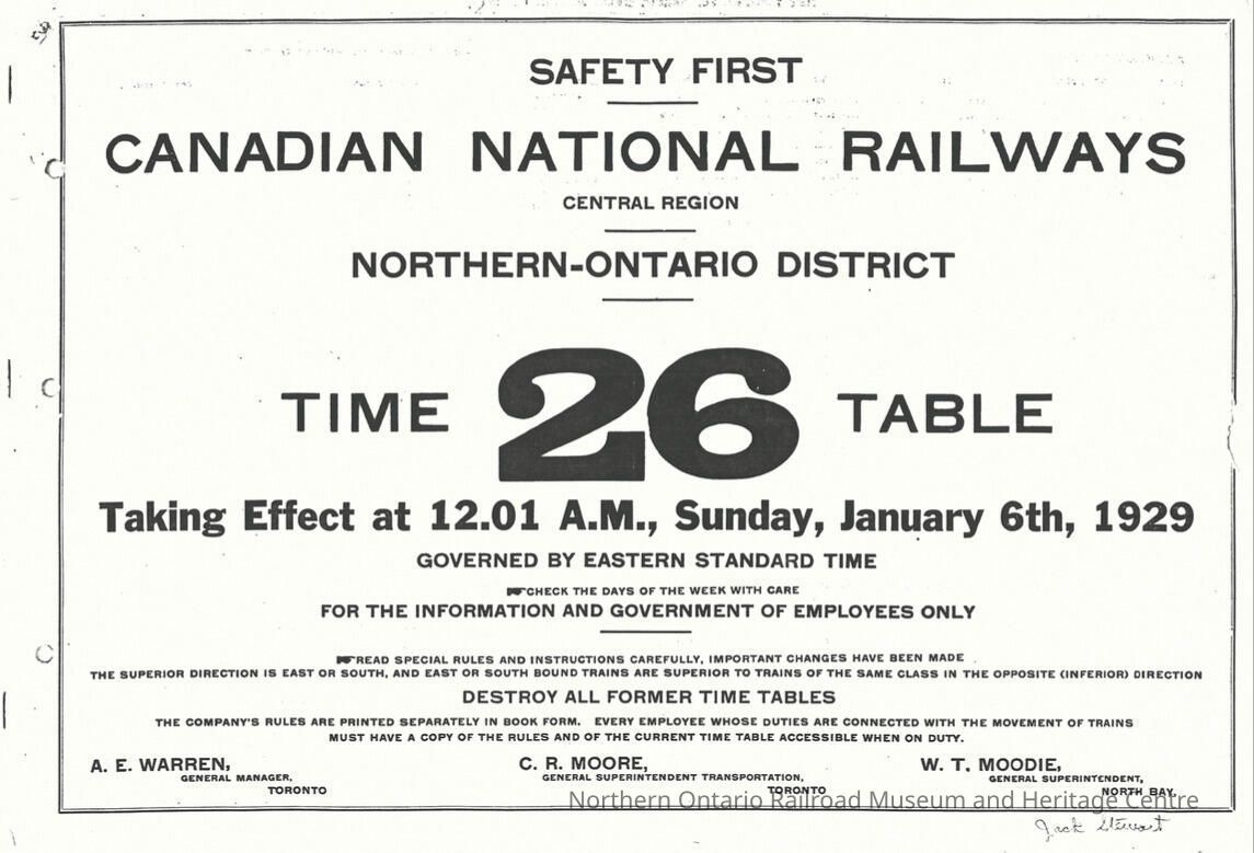 Canadian National Railways, Northern Ontario District Time Table 26, January 6, 1929Collection