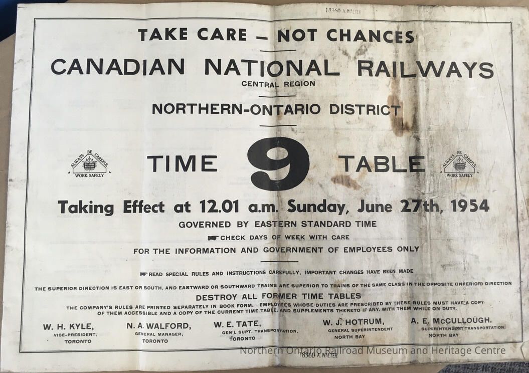 Canadian National Railways, Northern Ontario District, Timetable 9, 1954Entry/Object ID